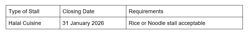 * Successful applicant is required to apply for a food stall license from Singapore Food Agency (SFA)