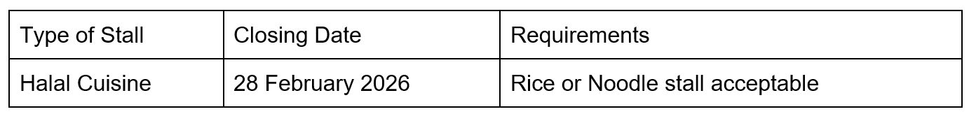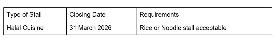 * Successful applicant is required to apply for a food stall license from Singapore Food Agency (SFA)